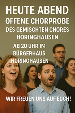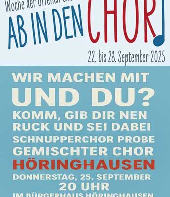 Wir laden Sie herzlich zu unserem Weihnachtsliederabend ein! Gemeinsam mit dem Gemischten Chor Höringhausen werden wir bekannte Weihnachtslieder singen. Datum: Donnerstag, den 11. Dezember 2025 Ort: Bürgerhaus Höringhausen Uhrzeit: Beginn…