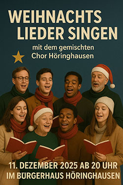 Der Gemischte Chor Höringhausen lädt alle herzlich zum gemeinsamen Weihnachtsliedersingen ein. In festlicher Atmosphäre möchten wir mit euch die schönsten Weihnachtslieder anstimmen und die Vorfreude auf das Fest teilen. Das…